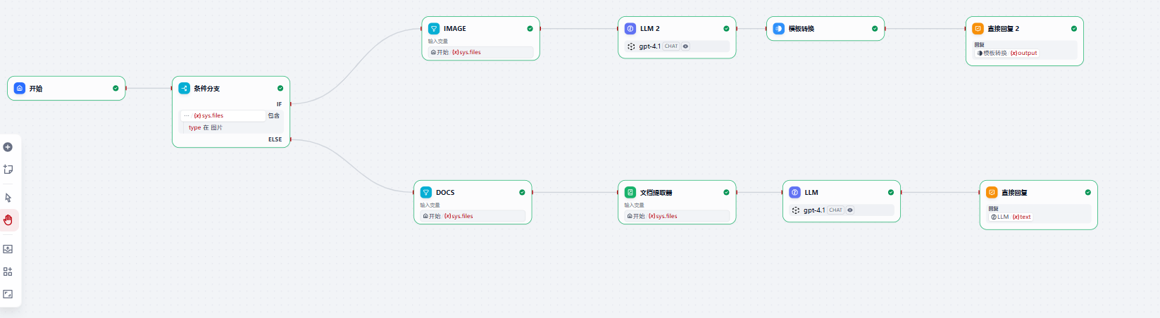 按照上面流程配置起来的工作流是对图片和文档单独处理,如果想同时传递多个附件文件,同时处理图片和文档,可以将条件分支去掉后就可以进行并行处理。
