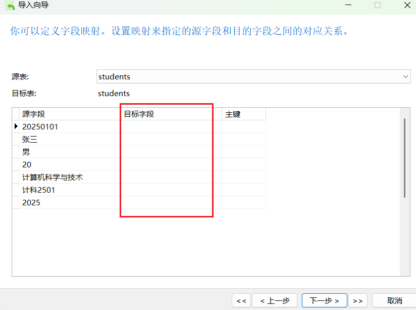insert into students values(20250101,'张三','男',20,'计算机科学与技术','计科2501',2025);