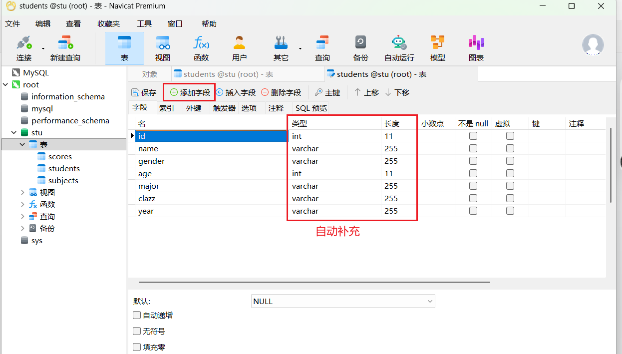 `age` int(10) DEFAULT NULL COMMENT '学生年龄',