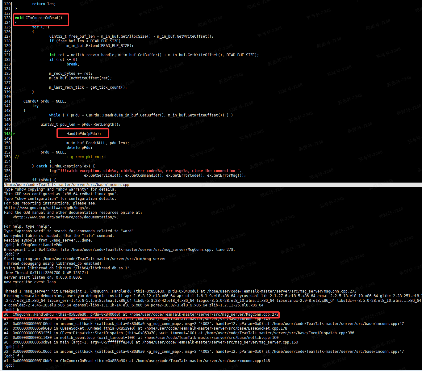 每个实例(比如:FileServConn、DBServConn、LoginServConn等)的业务处理在HandlePdu函数中,比如CMsgConn::HandlePdu如下,当socket可读时,会一层一层回调,调到CImConn::OnRead,OnRead中又调用HandlePdu(pPdu),根据多态会调用到具体业务子类的 HandlePdu函数,详细业务需要调试HandlePdu理解。