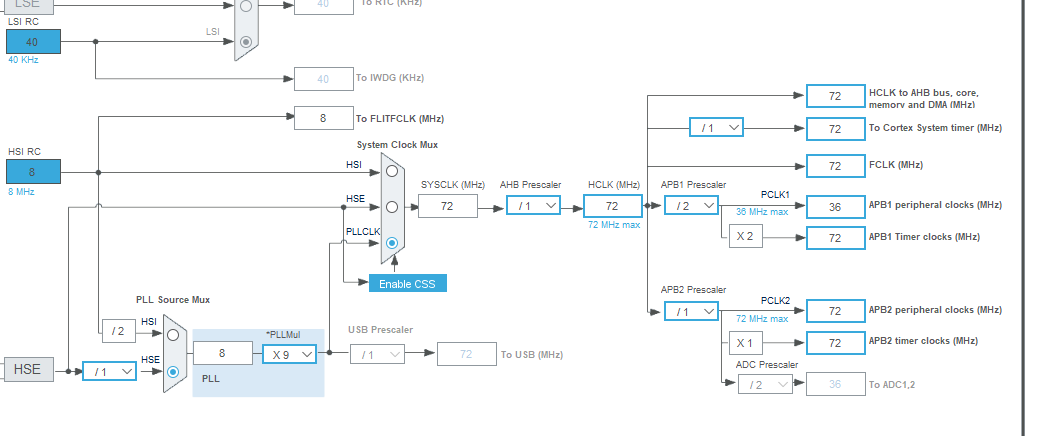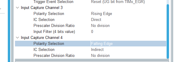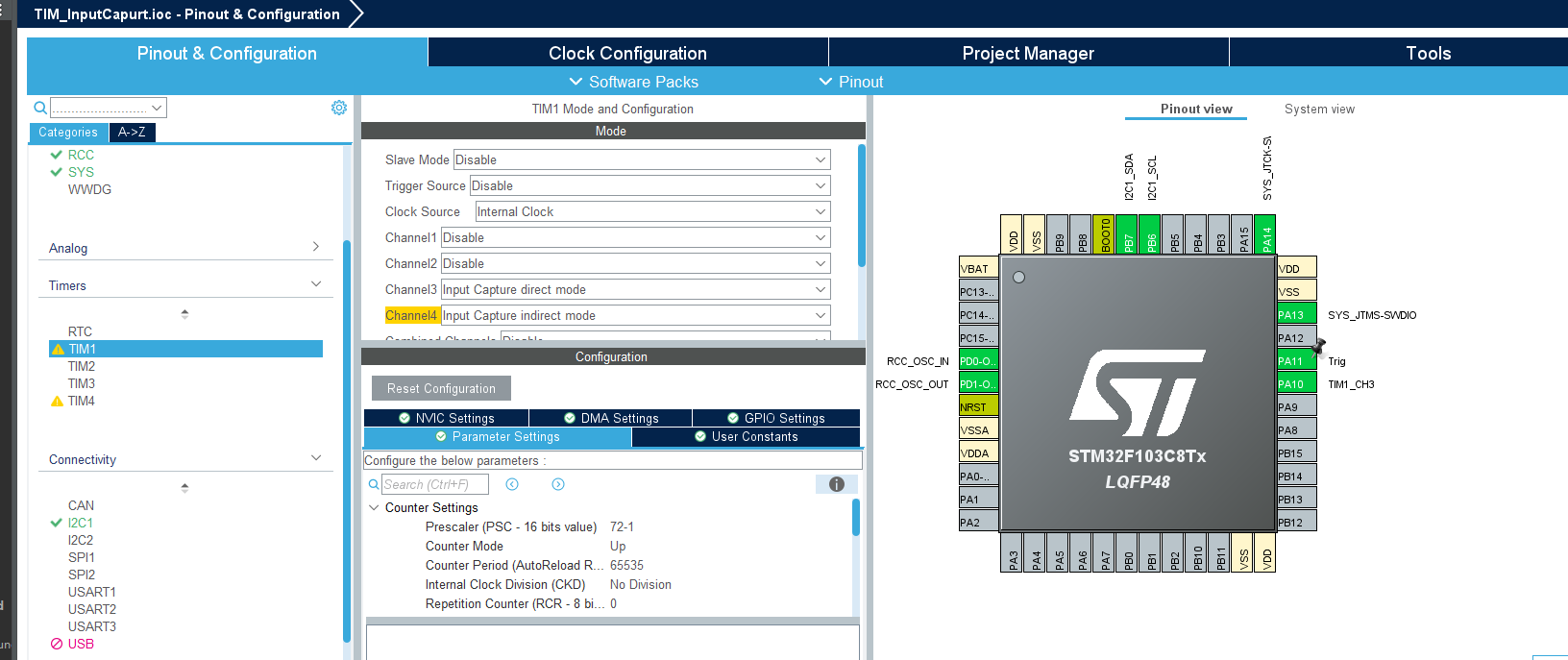 在TIM1将时钟源设置为内部时钟源,将通道3设置为输入捕获直接模式(Input Capture direct mode)将通道4设置为输入捕获间接模式(Input Caputre indirect mode)。将定时器的预分频器设置为72分频使计数器的频率为1MHz。在输入捕获通道3默认保持上升沿检测,在输入捕获通道4修改为下降沿检测。