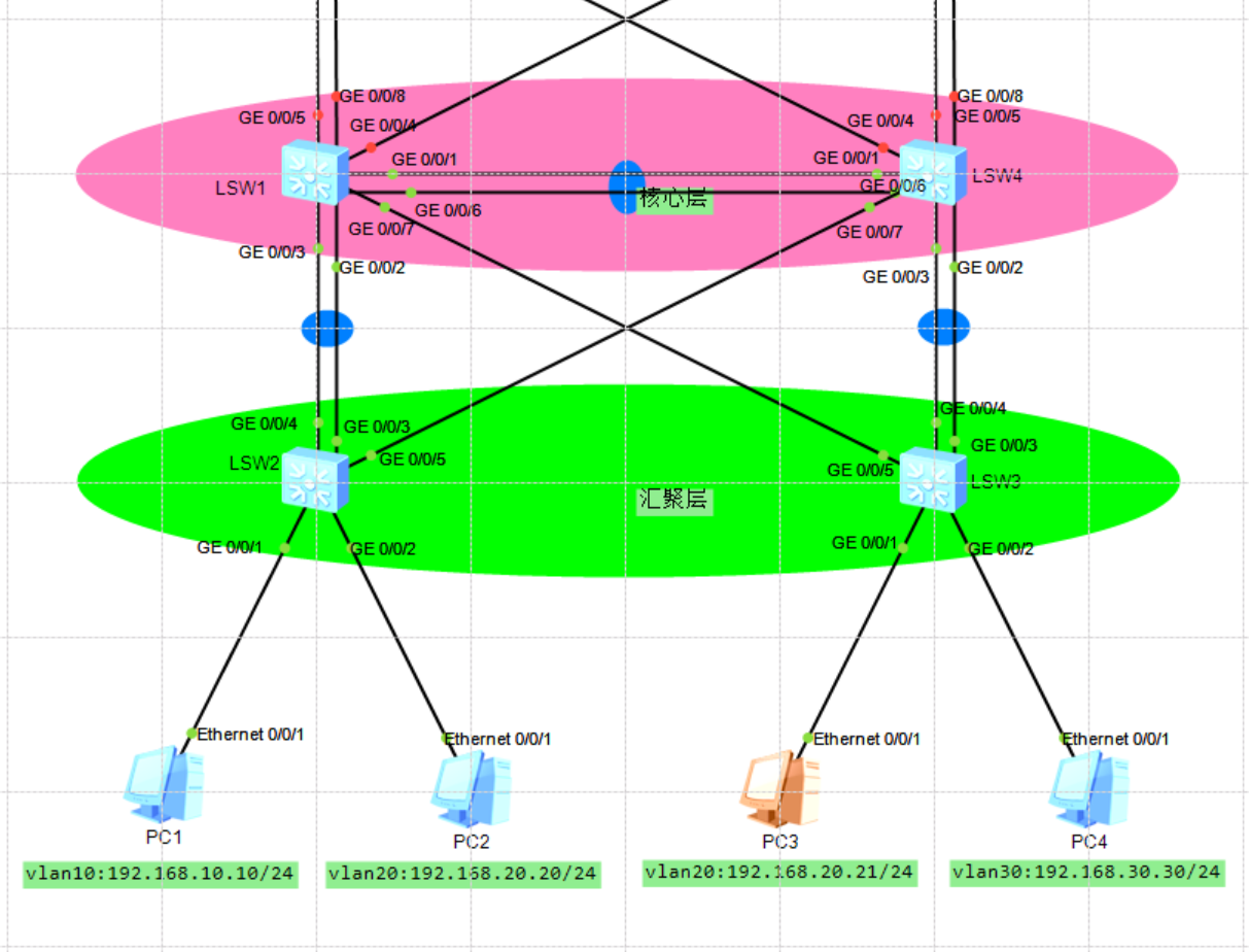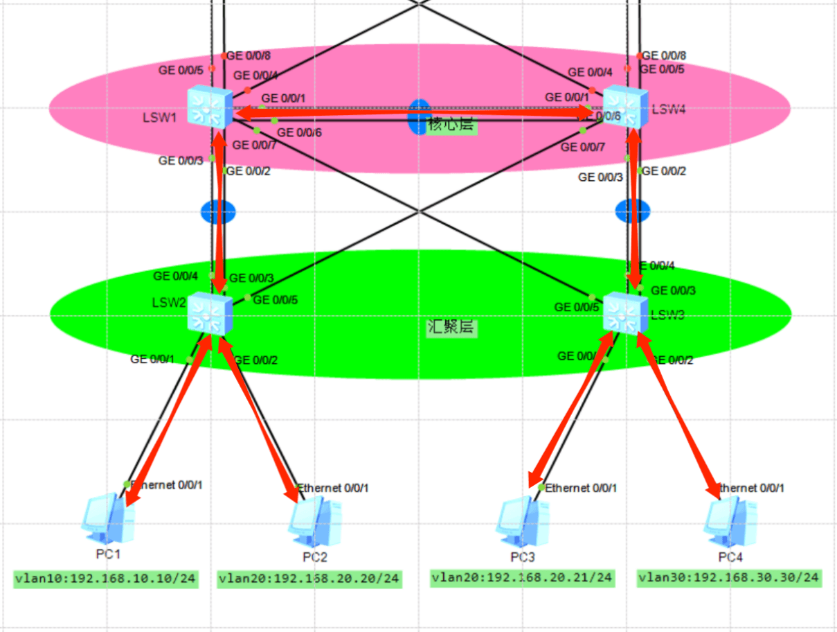 至此第一阶段配置完毕,我们现在能够实现在链路完整的时候报文能到LSW1,经LSW4抵达目标vlan终端。但现在双核心的双路负载没有生效(只有单路流量),主要核心就是链路聚合的负载方式,下面来配置: