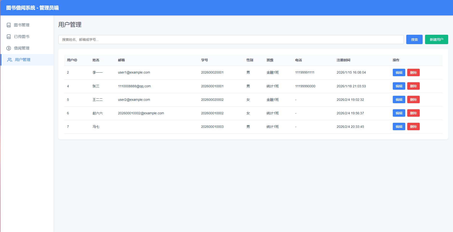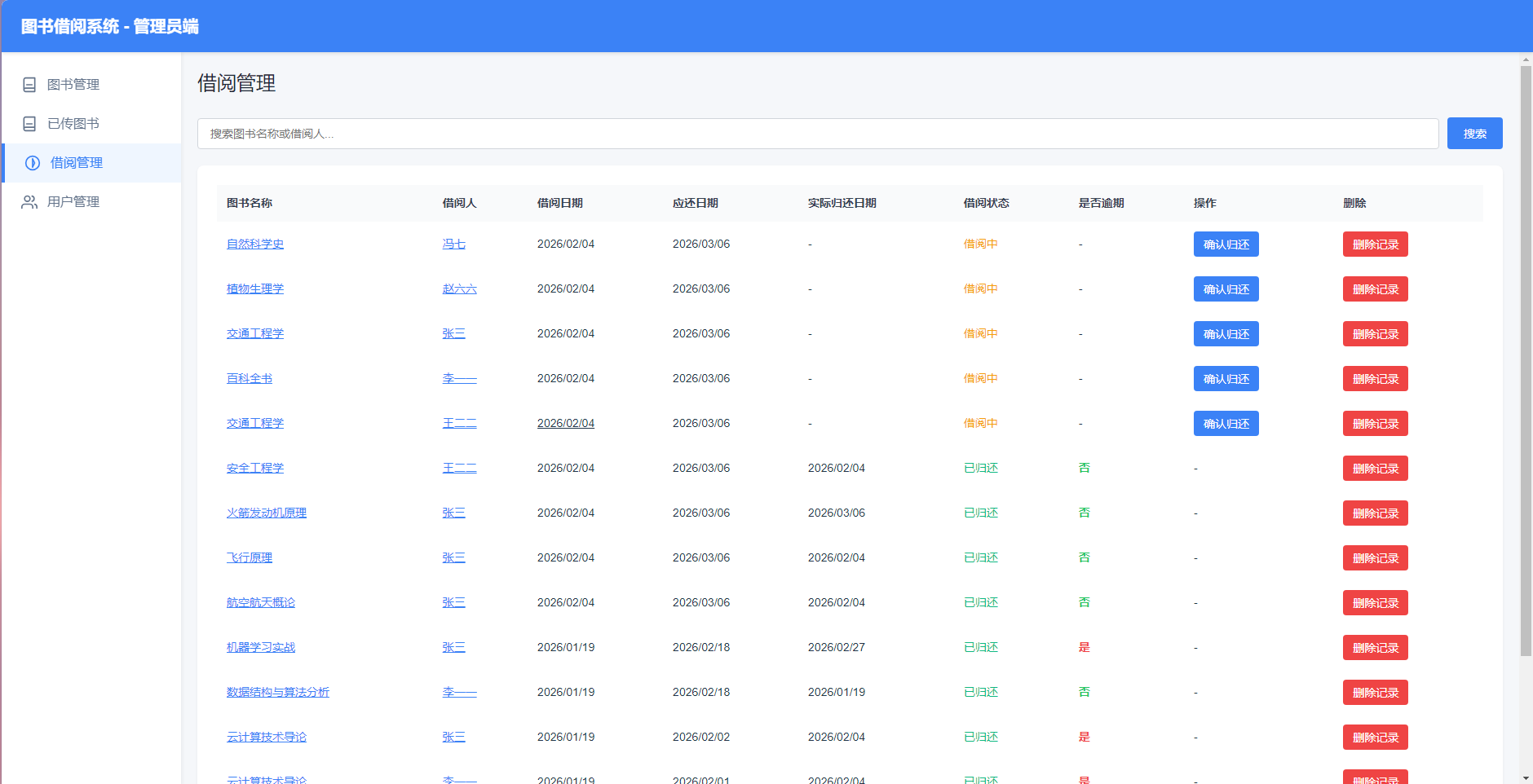 **管理员搜索**:支持按用户名和图书名称搜索借阅记录
