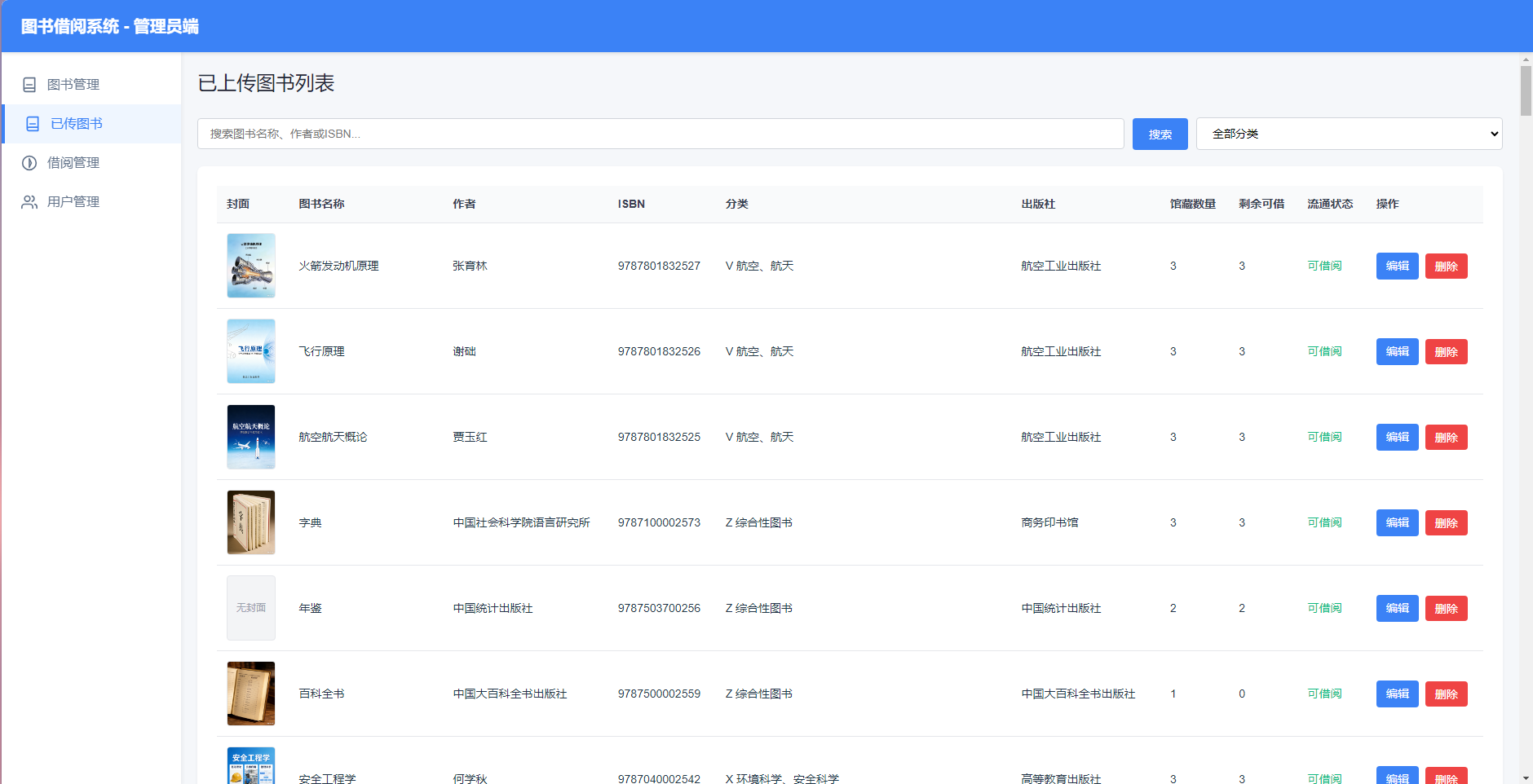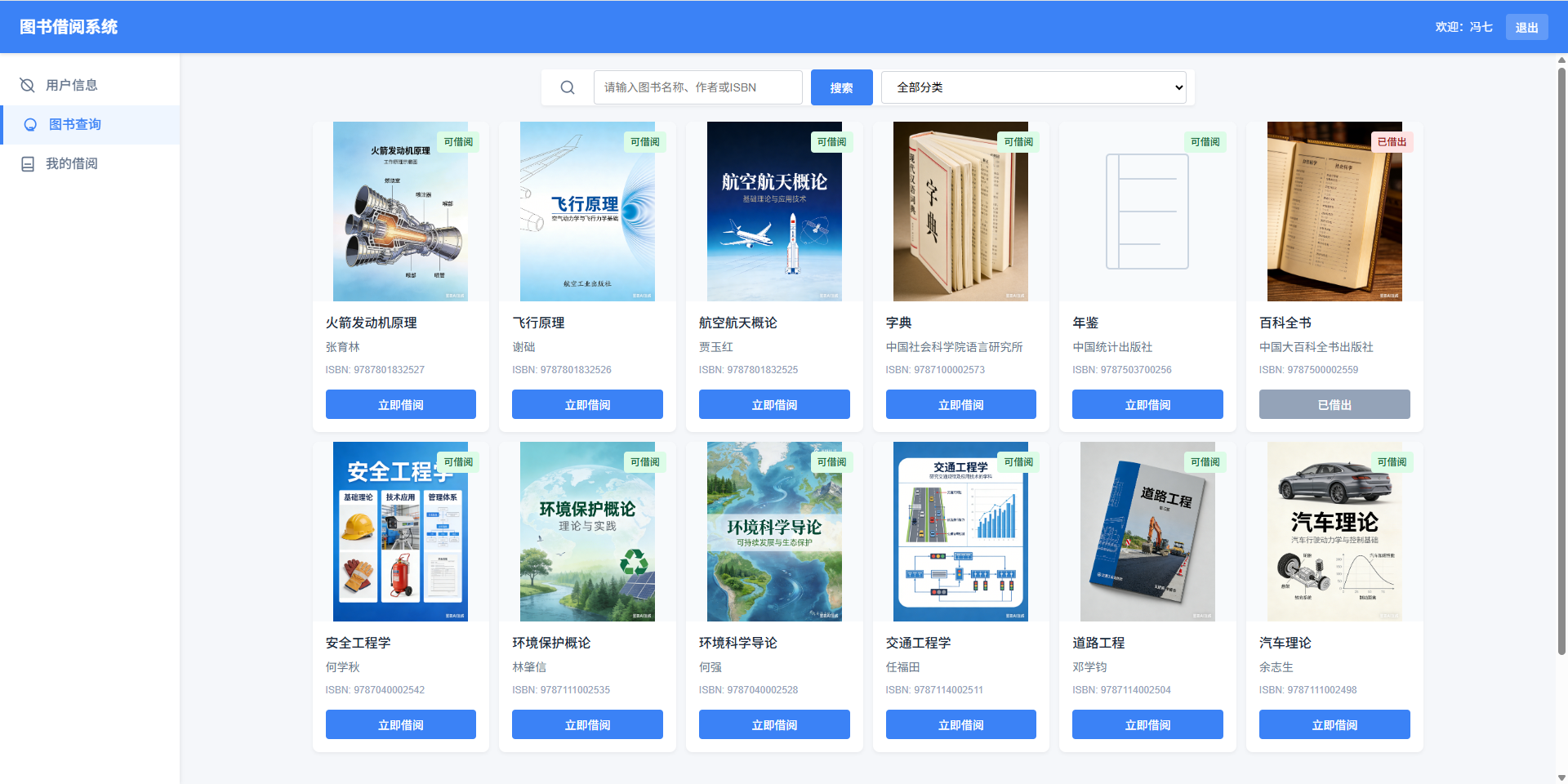 **图书列表**:展示图书基本信息、封面图片和可借状态