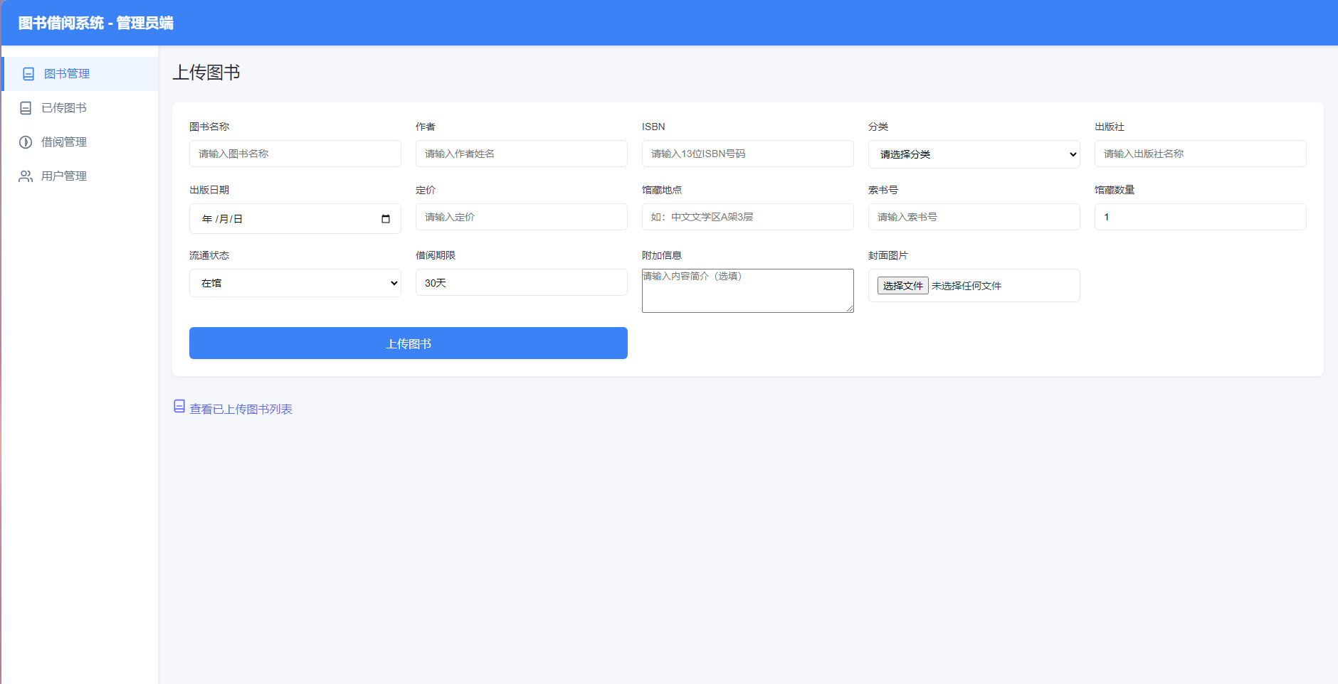 **图书上传**:支持图书信息批量上传,包含封面图片上传功能