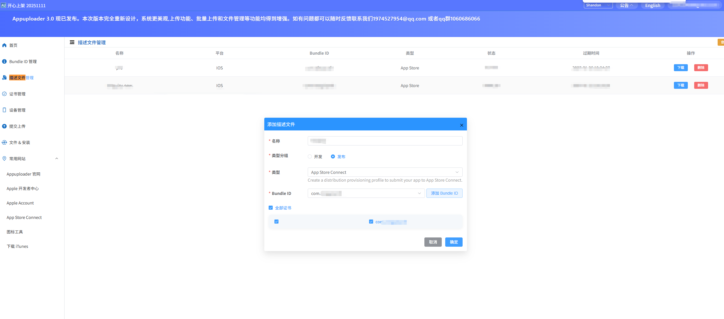 四、保存应用id权限后、回到Appuploader,进去描述文件申请页面,重新申请描述(修改了权限之前的描述文件会失效)文件上传开发工具打包即可!