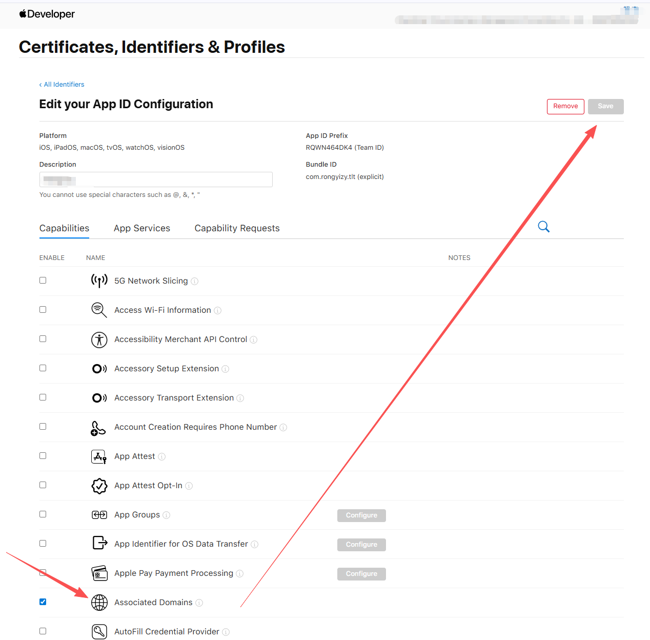 三、点击你要修改的应用id,然后勾选Associated Domains权限保存!