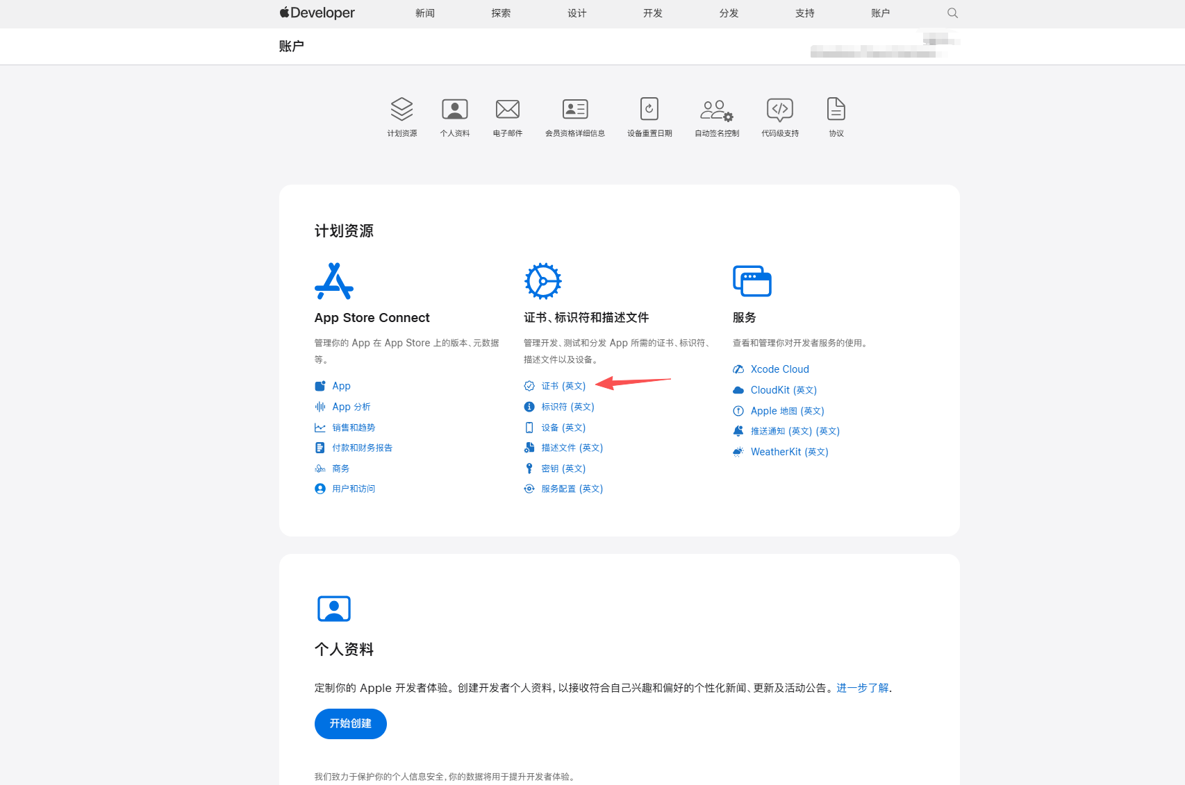 https://developer.apple.com/account,进入证书页面。