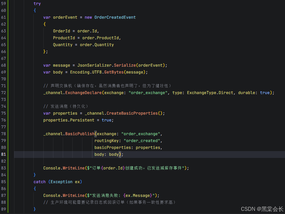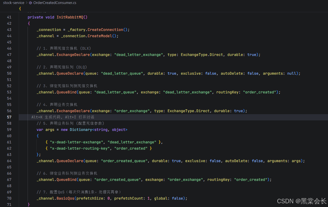 - 拓扑声明 :自动声明业务交换机 ( order_exchange )、业务队列 ( order_created_queue )、死信交换机 ( dead_letter_exchange ) 和死信队列 ( dead_letter_queue )。