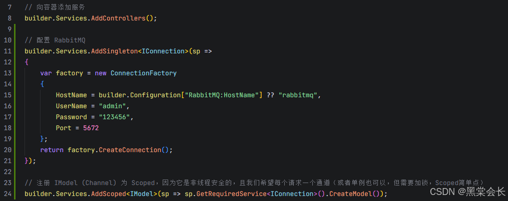 Program.cs,添加RabbitMQ配置:注入 RabbitMQ IConnection 和 IModel