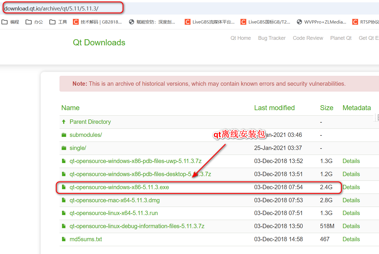 补充:例如想通过离线安装包安装QT5.11版本,当然QT5.15版本之后官网不提供离线安装包