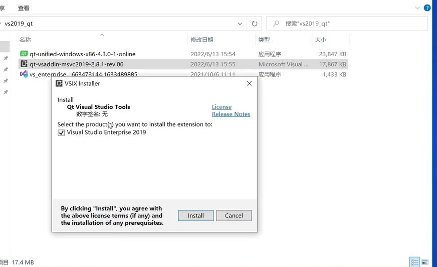点击插件进行安装,安装成功即可在vs中进行qt开发,实测VS2019可选择2.8.1版本