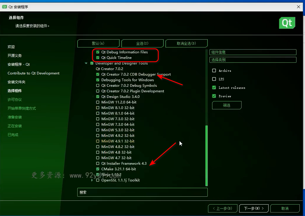 注意这里选择安装qt版本和组件