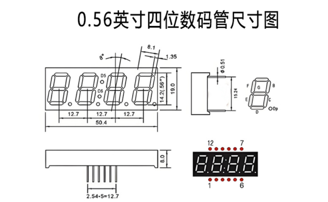 数码管封装尺寸决定了电路板上的占位,常见尺寸有0.28英寸、0.36英寸、0.56英寸等。