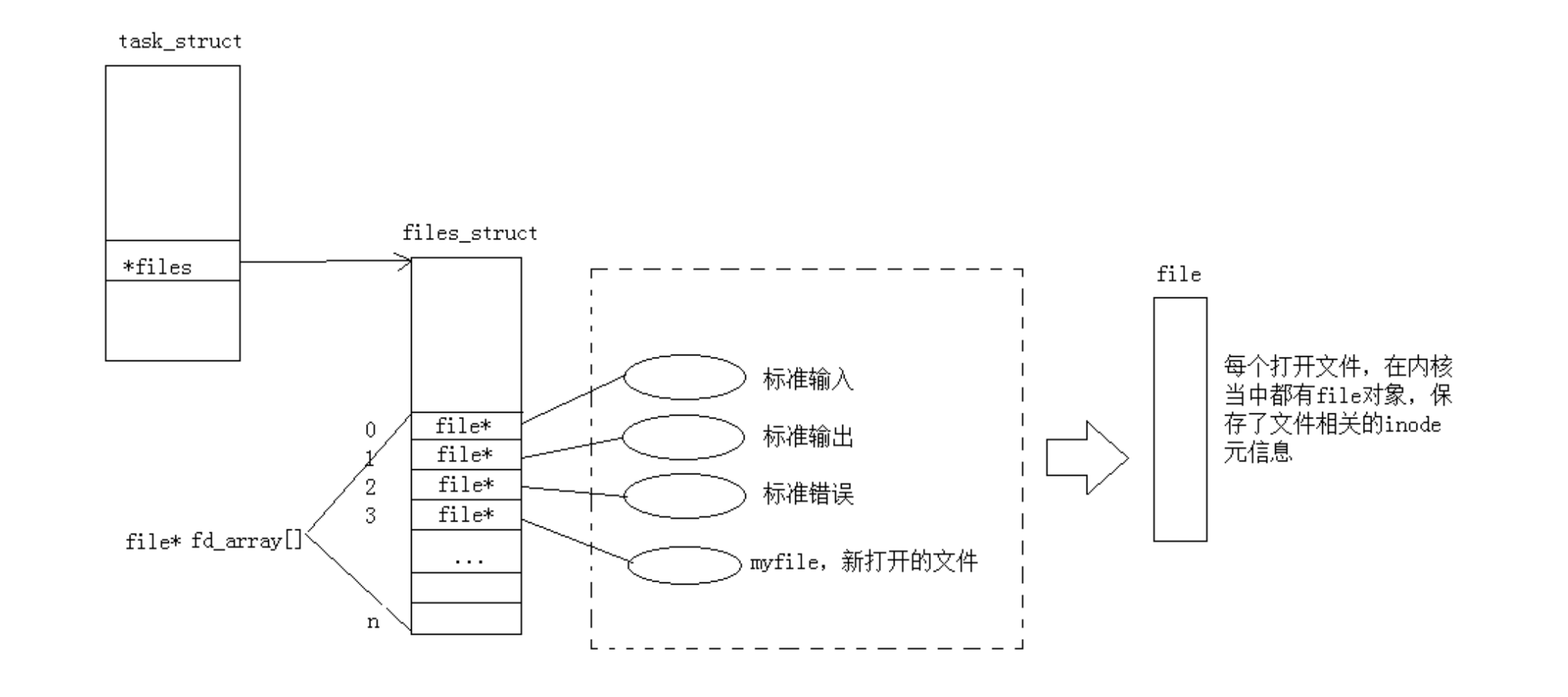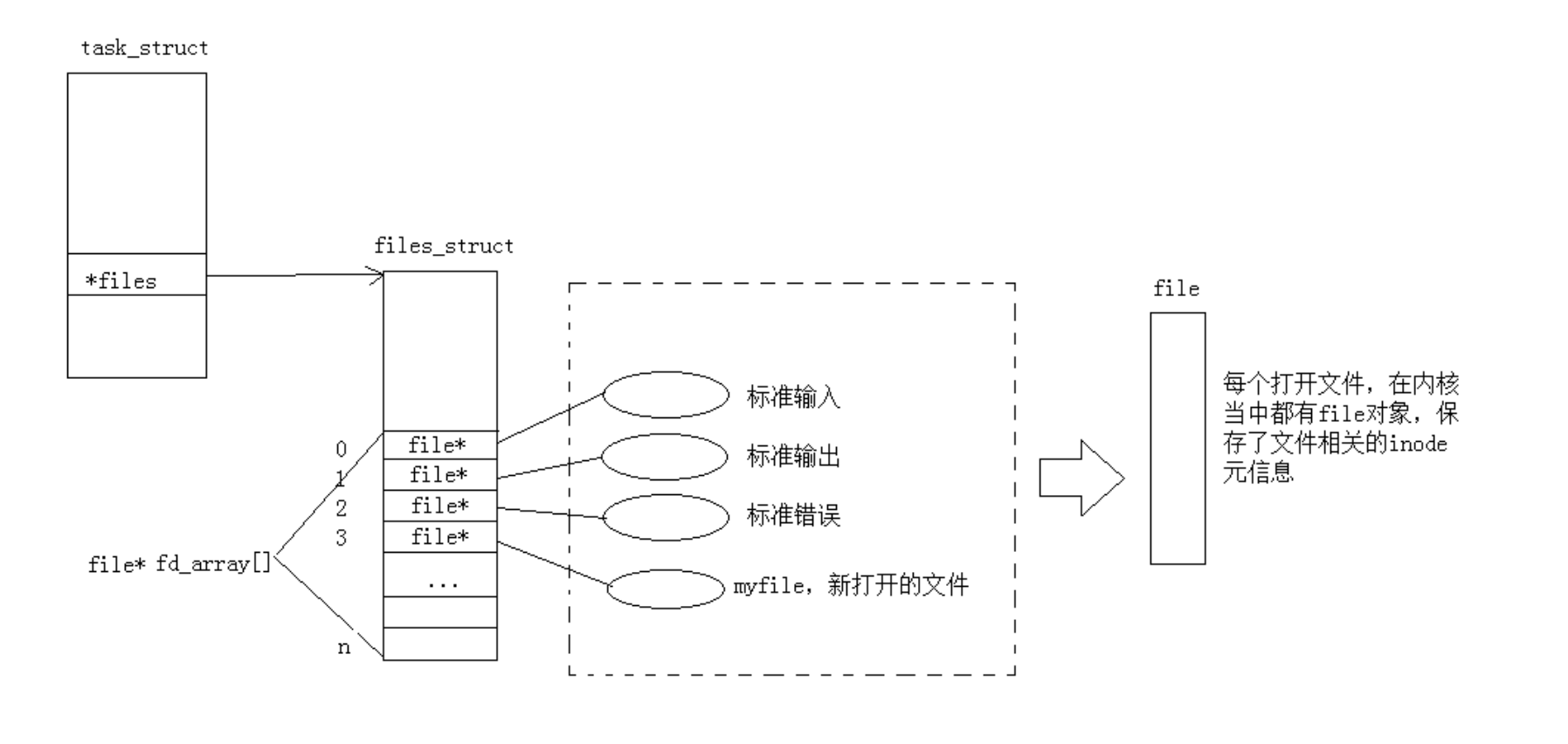 再准确点说,PCB--task_struct结构体中存在着file指针指向文件管理结构体,file指针指向files_sruct结构体,files_struct结构体中存放着fd_array结构体指针指向更具体的文件结构体,这个下标也就是fd。