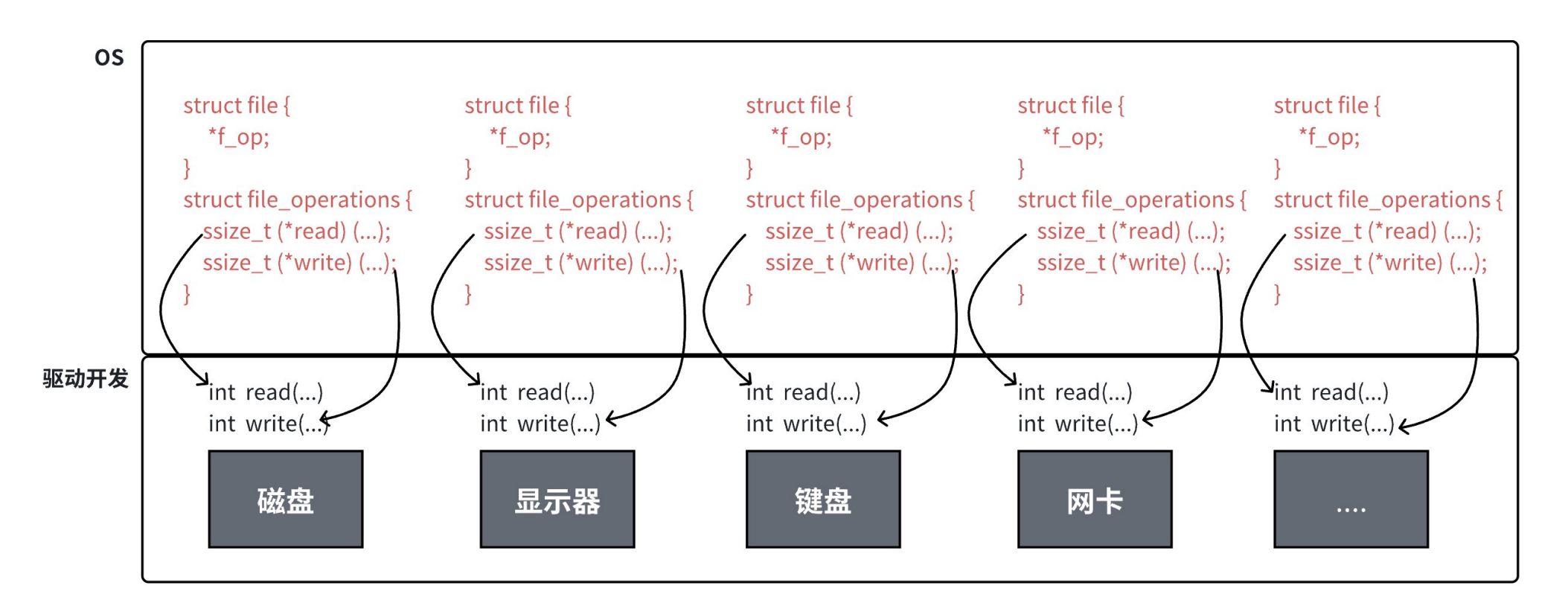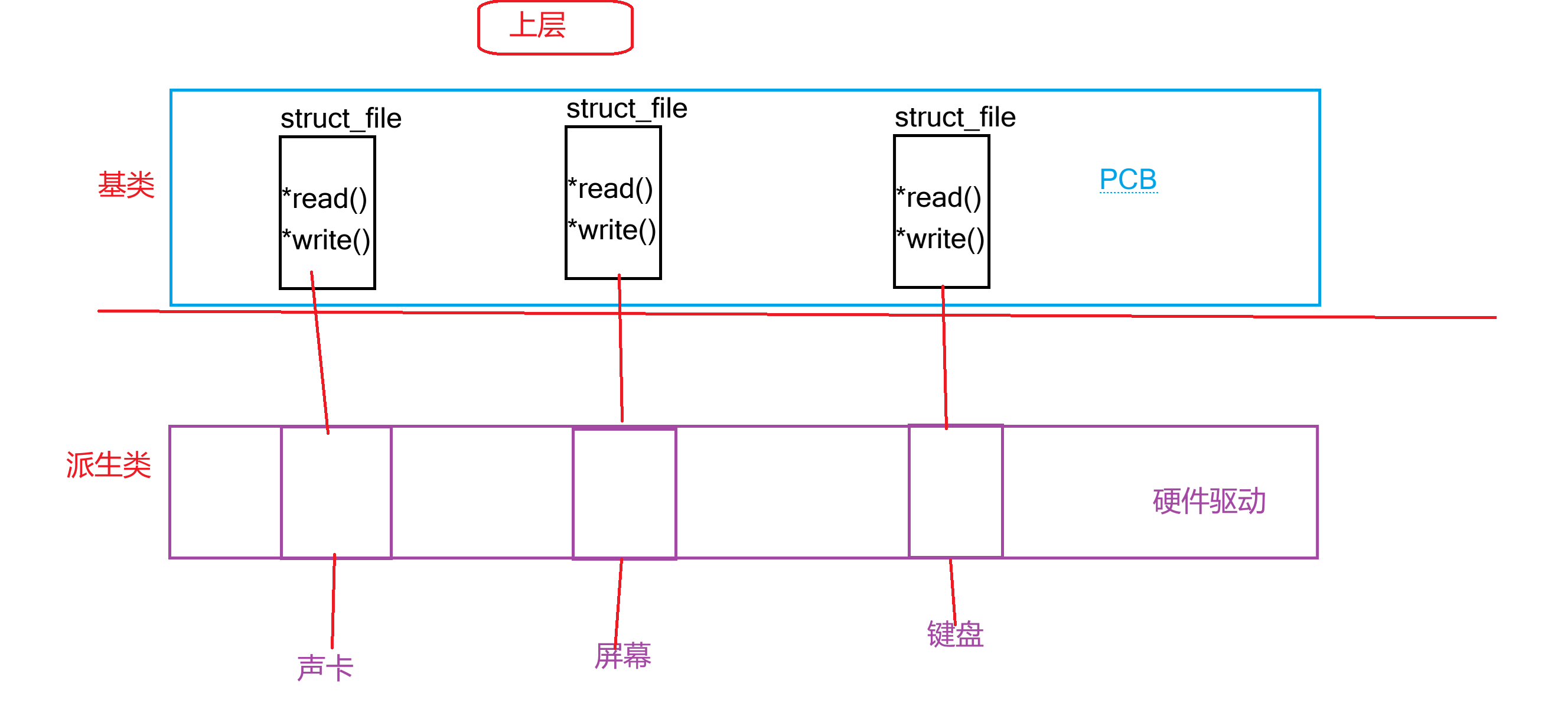 Linux下一切皆文件,对于每个硬件来说都会有对应的文件数据结构struct_file来管理。struct_file结构体中封装的方法在上层保持一致,即使在具体的底层实现虽然并不一样也能保持较高的不同硬件的统一调度。