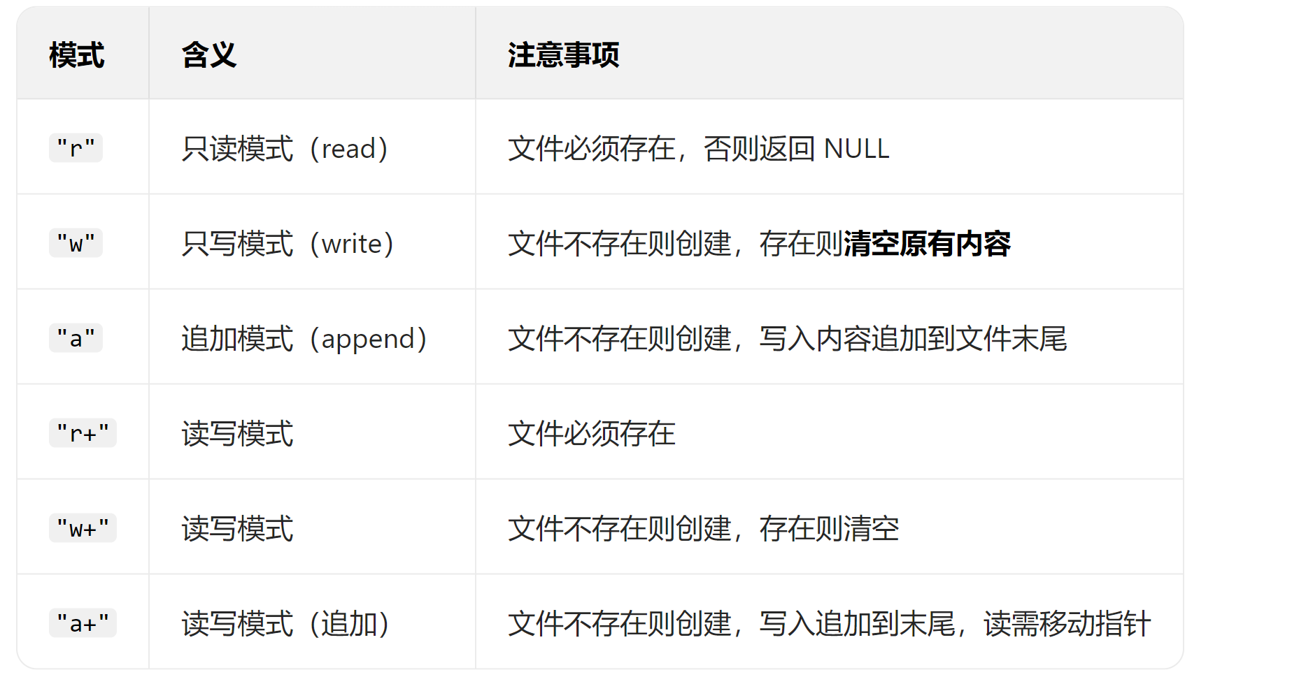 需要补充的是,上述模式都是权限声明+初始化。权限声明为向操作系统提前打好招呼说明该操作具备读/写的权限方便后续操作,也就是说具体的读/写还需要额外的操作来实现。初始化则为开始时对文件的各项初始化措施,例如清空文件或者是创建文件等等。