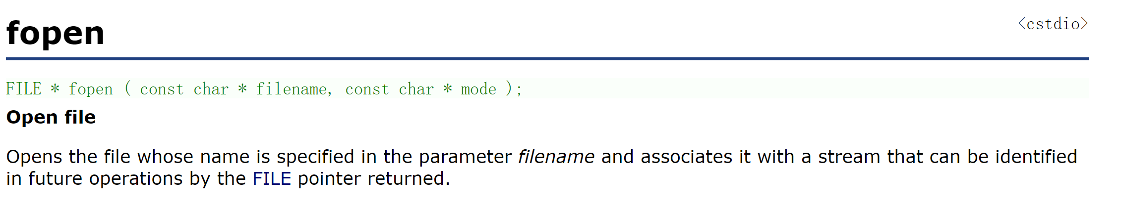 fopen函数的头文件是 stdio.h ,其能以指定模式(mod)打开指定文件(filename),filename需要提供文件的路径,mod则是确定文件的打开方式。FILE是一种特殊的类型,这个稍微后面讲。