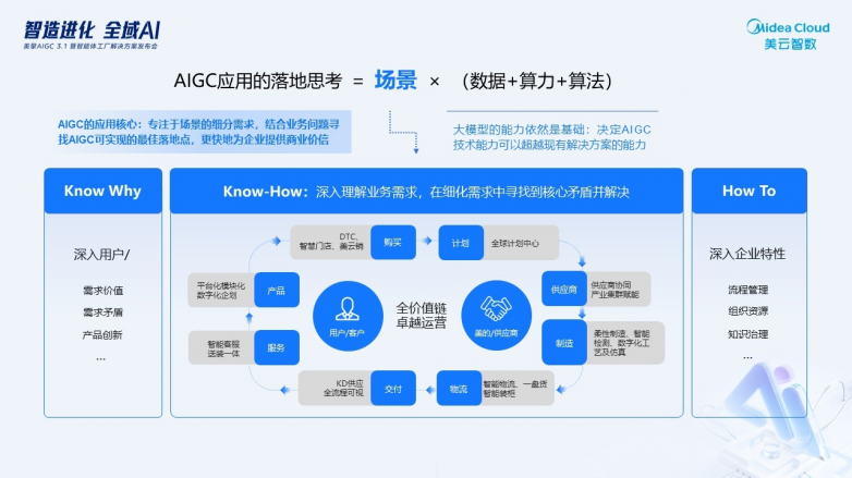 美云智数提出**"** AIGC应用落地=场景×(数据+算力+算法)",以"工具阶段---业务融合---智能体工厂"三步走为主线,围绕企业端到端流程(LTC/OTC/P2P/IPD/ICP)与订单交付(OTD)构建价值流管理(VSM)与指标体系,打通跨事业部与平台协同,形成"可视、可度量、可追责"的运营闭环。依托统一知识库、标准接口、模型治理与数据安全合规,美云智数实现多智能体协同、产线---车间---工厂三级实施稳步推进,破解业务碎片化,显著提升经营效率与交付稳定性。