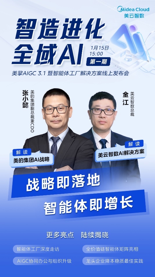 作为6场直播的系列发布会首发活动,美的集团副总裁兼CDO张小懿与美云智数总裁金江,分别从战略高度与实践层面,共同探索AI技术赋能制造业的创新路径:张小懿以"场景驱动+技术赋能"为核心框架,深入解析美的在AIGC领域的落地策略;金江则结合一线实践,详述美云智数如何通过数字化与AI技术的深度协同,打通制造业全价值链,推动产业降本提效。