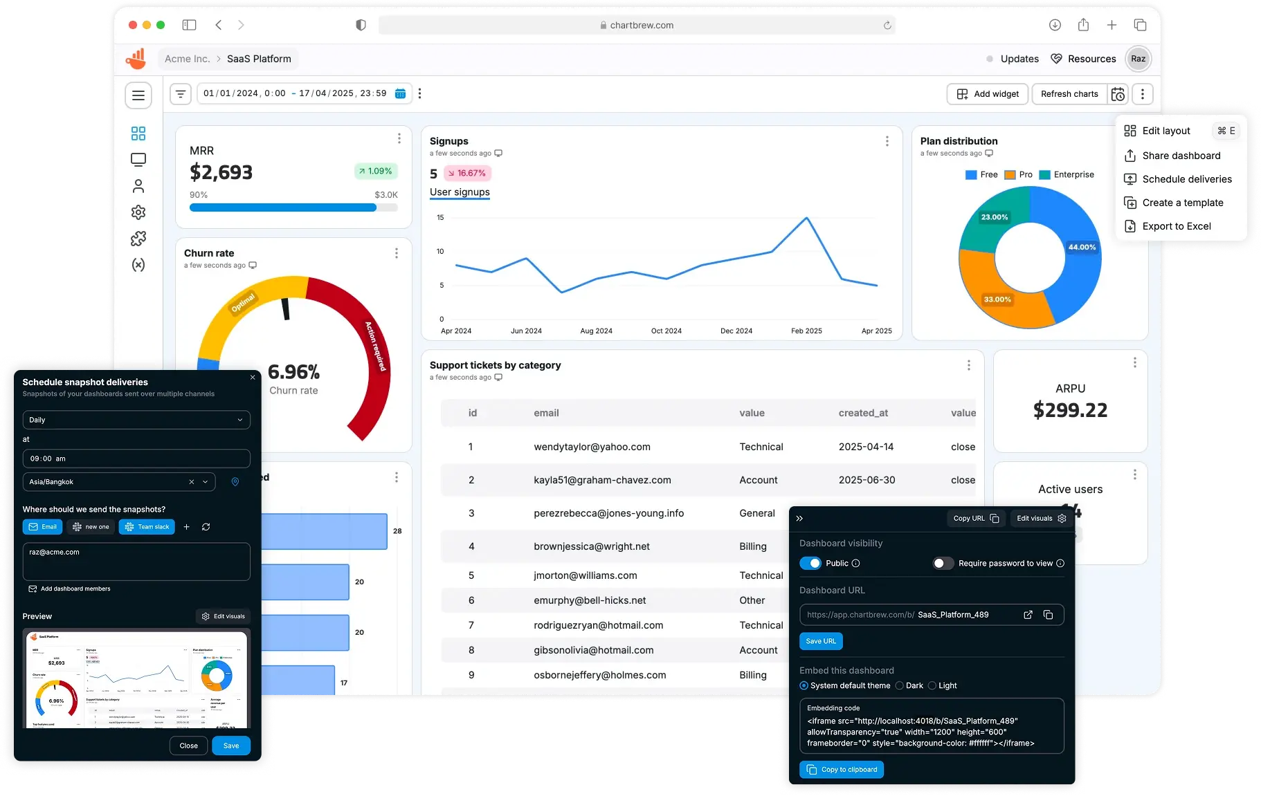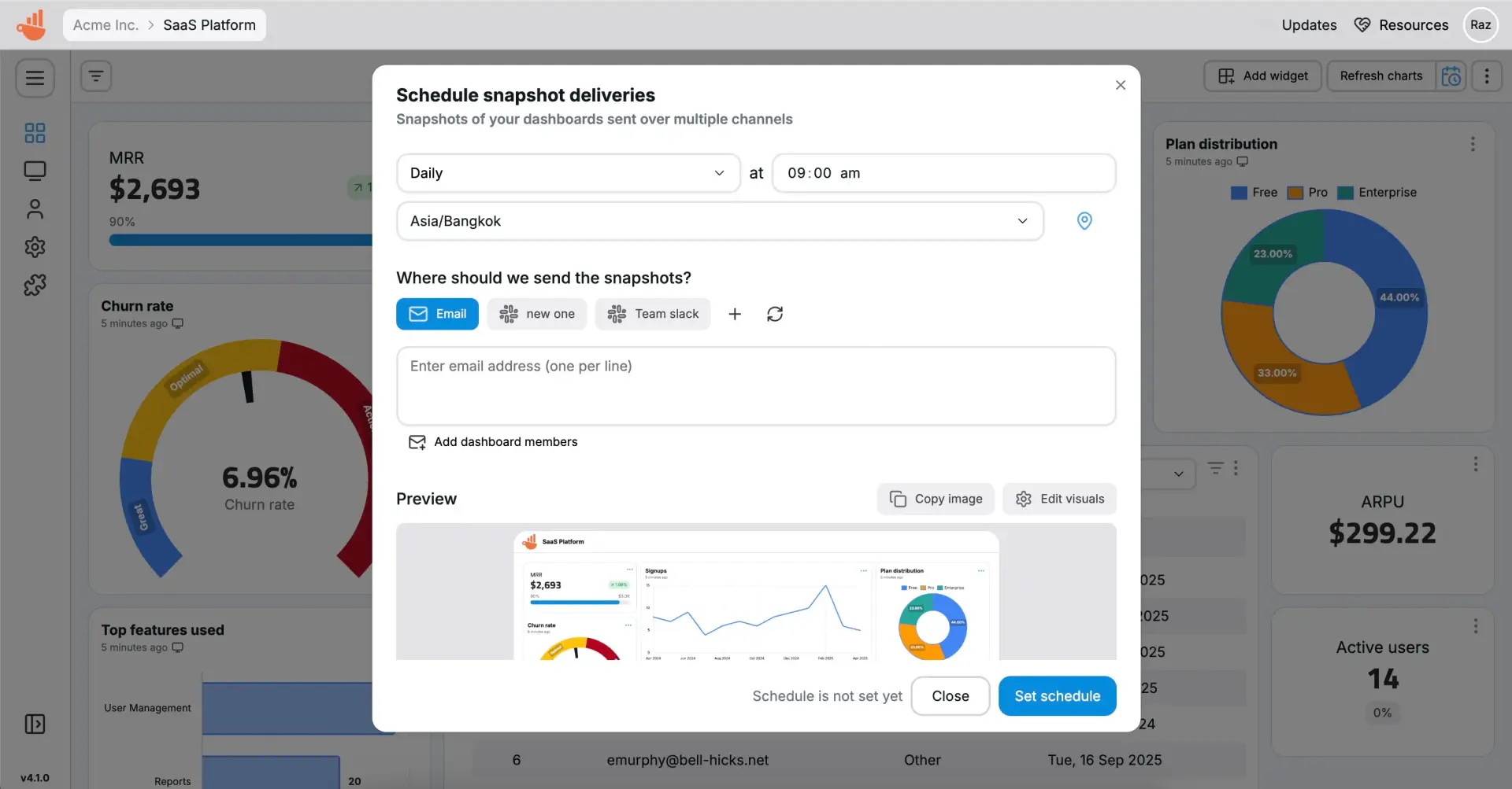 定时报告分发:用户可以设置定时任务,让系统在指定时间自动生成仪表板的"数据快照",并通过电子邮件、Slack 或者 Webhook 自动发送给指定的客户或团队成员。