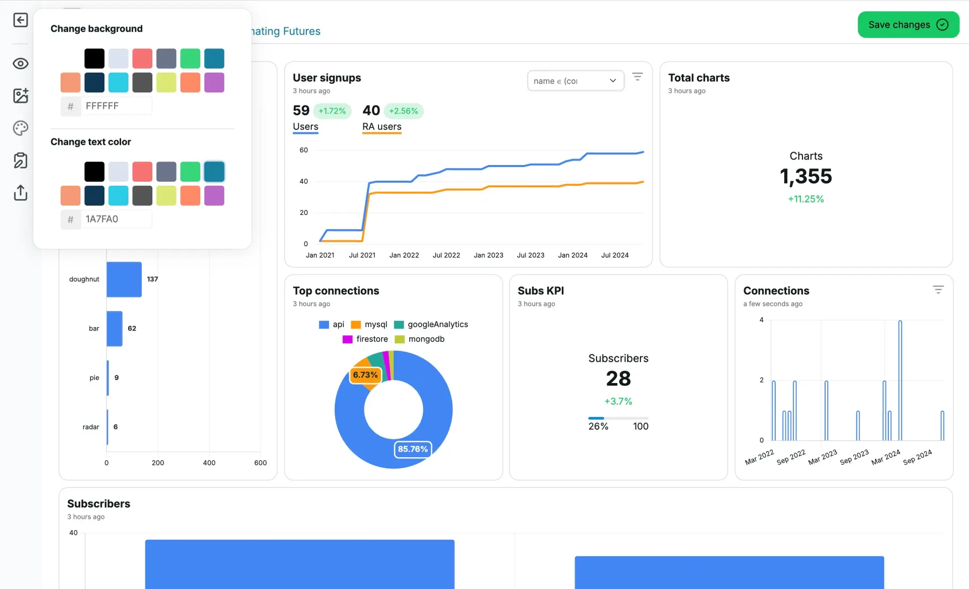 嵌入与集成:可以通过 iframe 或者 SDK 将整个仪表板或单个图表无缝嵌入到任何网页或内部系统,能直接将 Chartbrew 仪表板集成到 Strapi 管理后台。