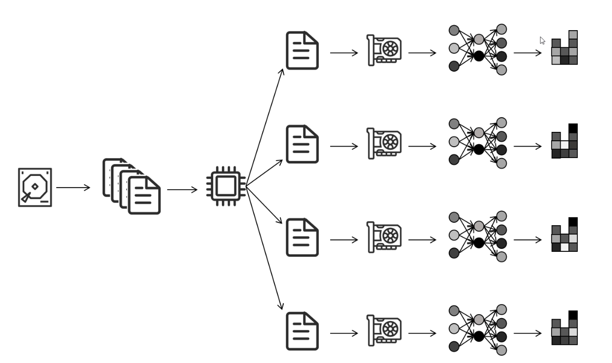从硬盘读取数据,然后一个cpu进程将数据分成多份,给每个GPU训练,然后计算出梯度 进行网络更新(无效更新),然后再将各个GPU算出来的梯度,返回到gpu0进行梯度平均,再更新网络0,网络0再把更新后的网络参数广播到其他网络上。