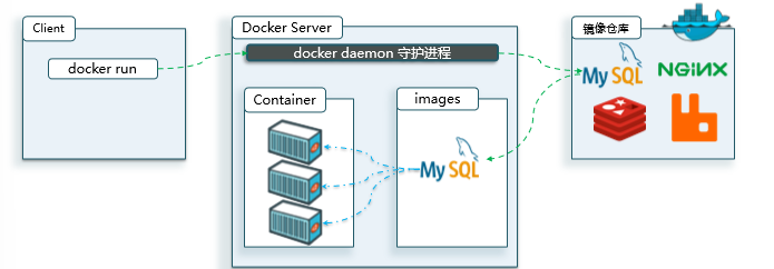 - Docker 是 C/S 架构,客户端发命令,守护进程做实际操作;