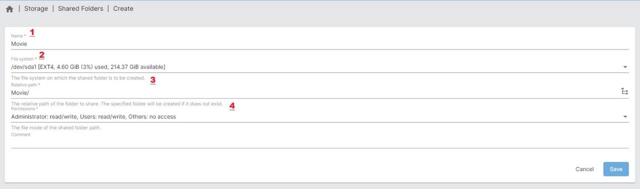 用户可以选择在挂载的分区中创建新共享文件夹并设置适当的访问权限(读取/写入)