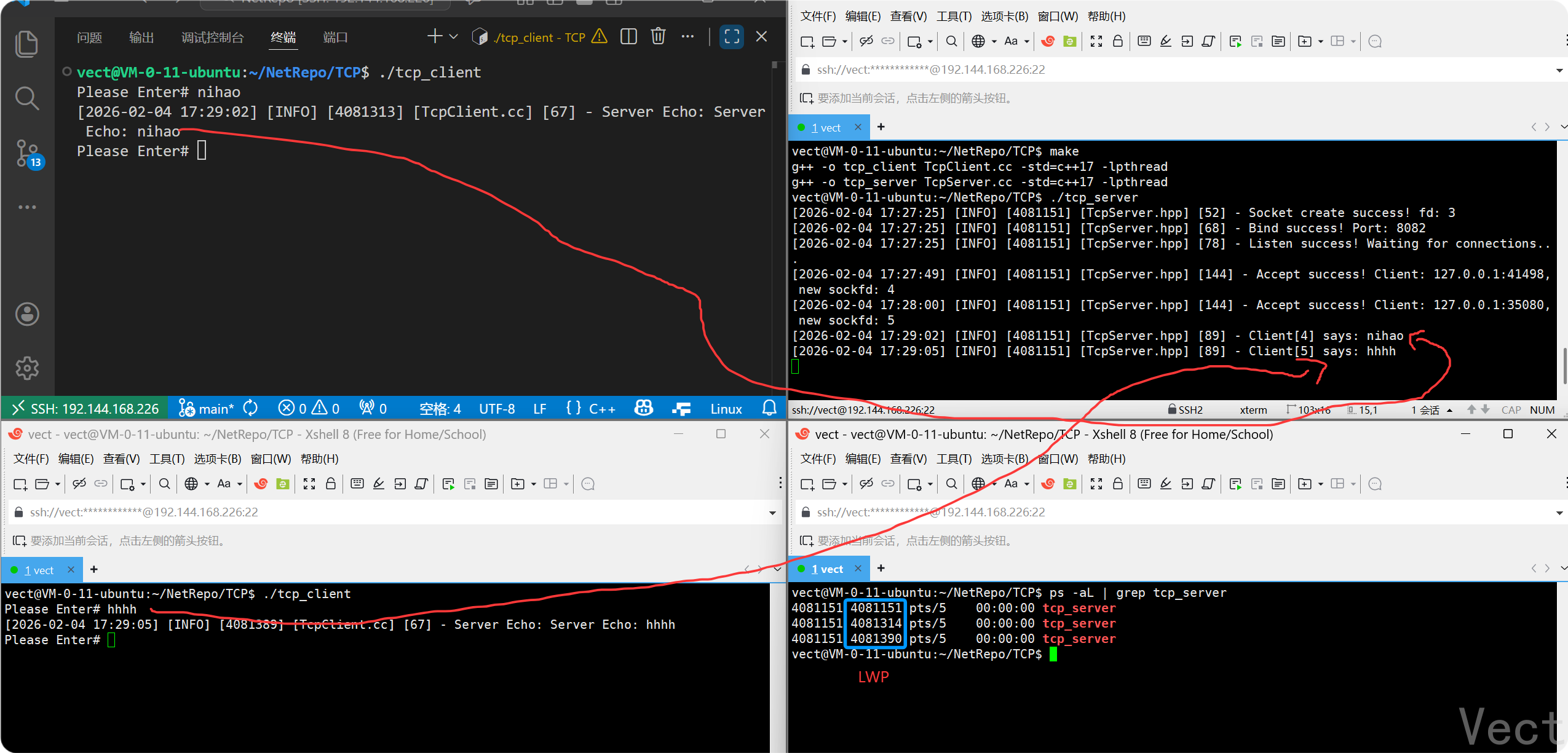 4081151 4081390 tcp_server <-- 线程 B (服务员 2)
