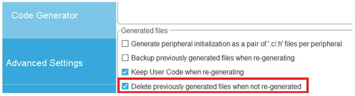 成的文件将被删除。比如,之前的代码生成的时候使用了UART外设,从而生成了