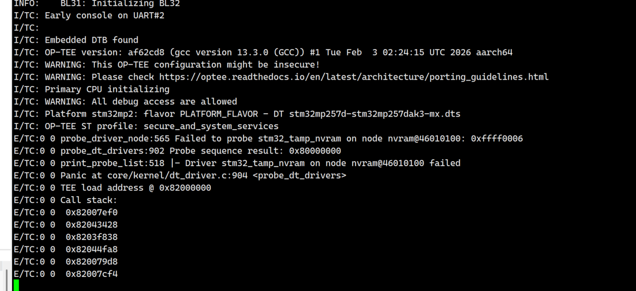 上一章已经可以通过 串口看到 TF-A 的启动日志 ,但系统在 TF-A 阶段发生 PANIC,无法继续启动。本章节主要记录 TF-A 启动阶段的典型报错、原因分析以及对应的 Device Tree 解决方案