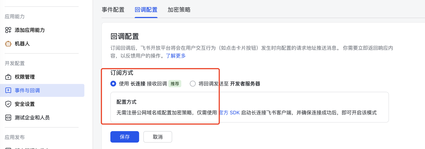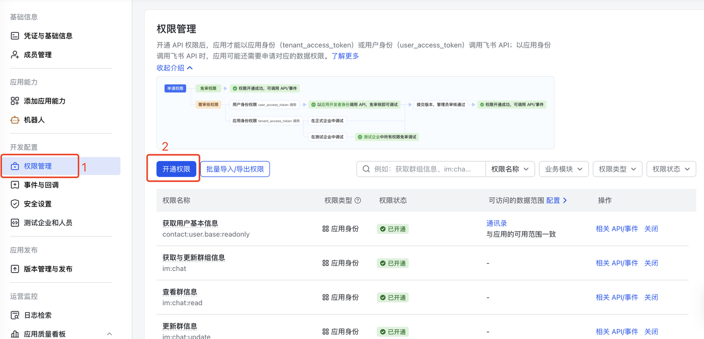 完成权限和事件订阅配置后,必须创建版本并发布应用,否则配置不会生效!