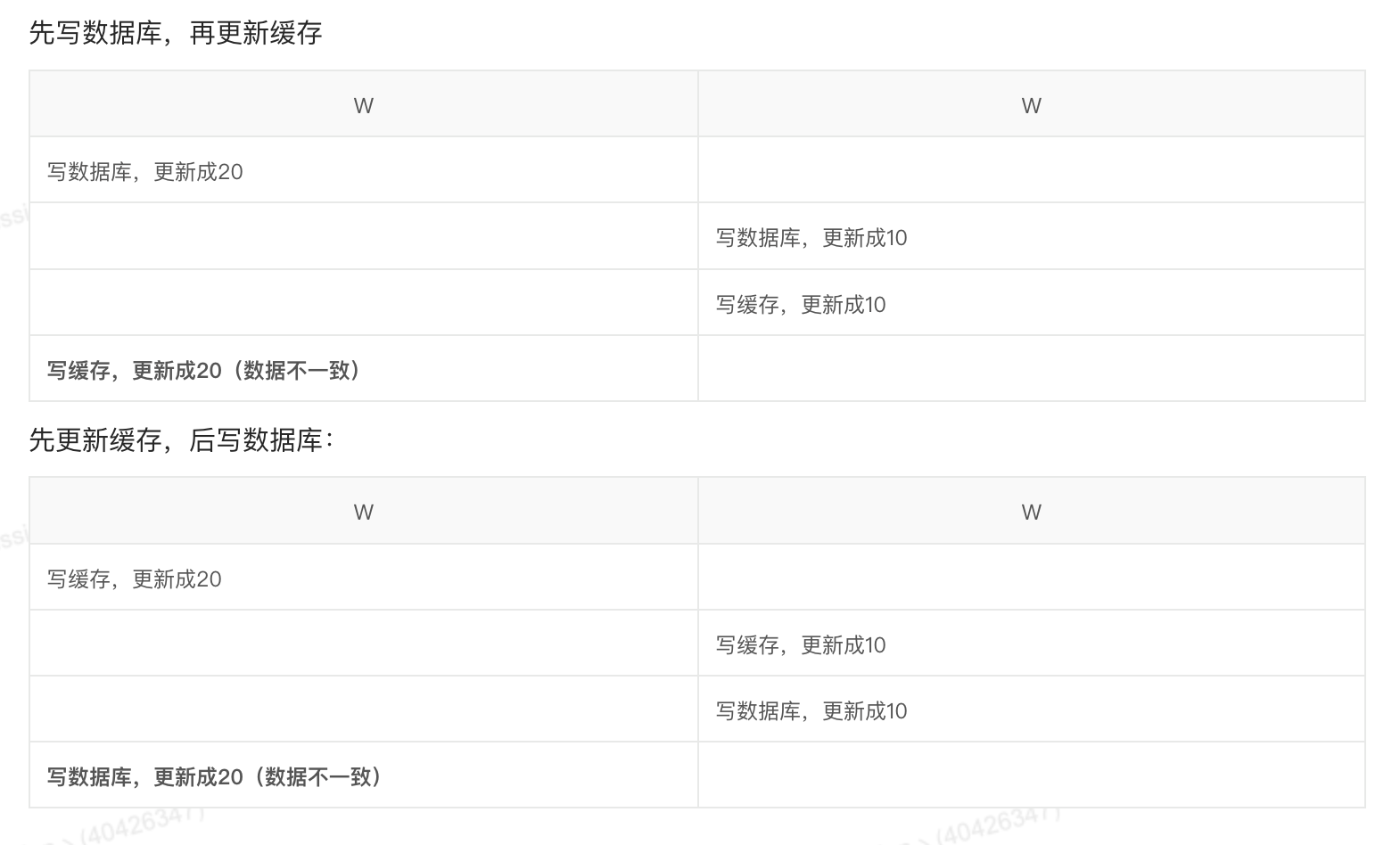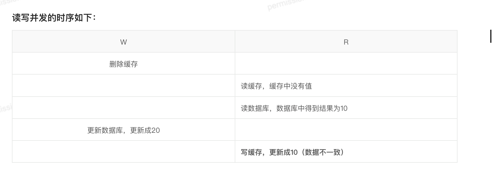 线程 B(写) :在线程 A 写入缓存之前,抢先执行了 更新 MySQL 和 删除缓存(此时缓存本就是空的)。