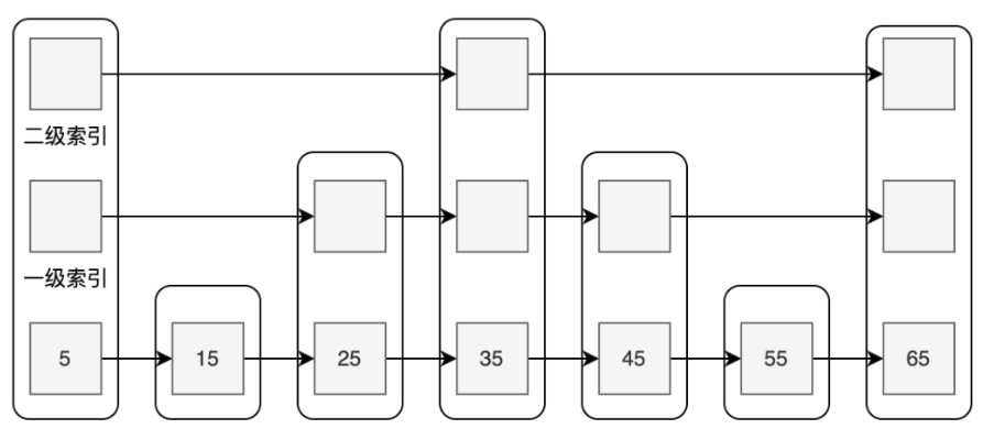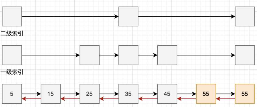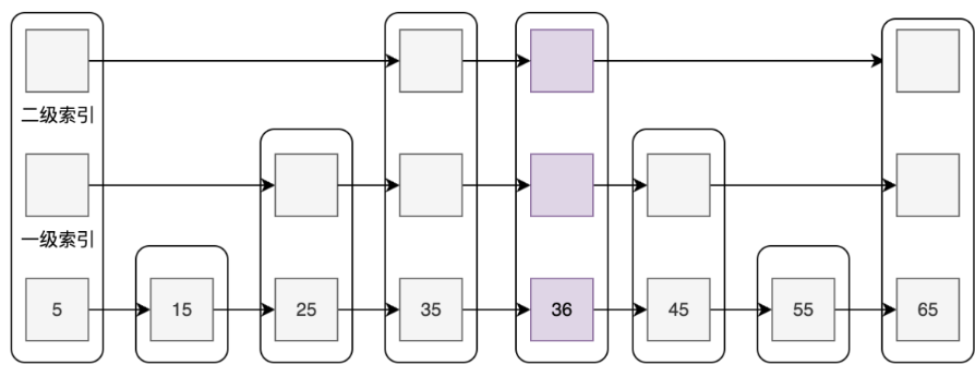 如果只有原始的链表,那需要走4步,如果有图中的二级索引,只用走2步,那如果找45呢,其实就是从第1个节点出发,通过二级索引走到35,再查看到下一个节点是65,已经超过了,所以降低到下方的索引,也就是一级索引,往后走一次就可以找到45。