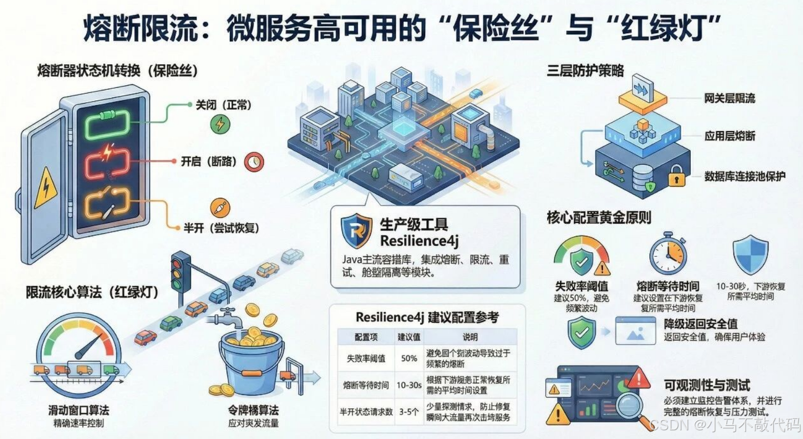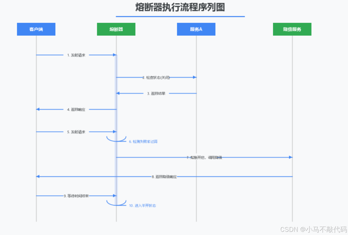 熔断(Circuit Breaker):当检测到下游服务故障率达到阈值时,自动切断调用,快速失败,保护系统稳定性