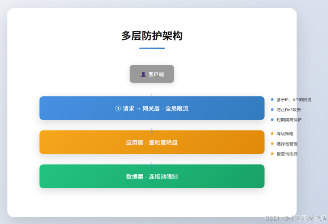 在高并发系统中,我们采用多层防护策略: