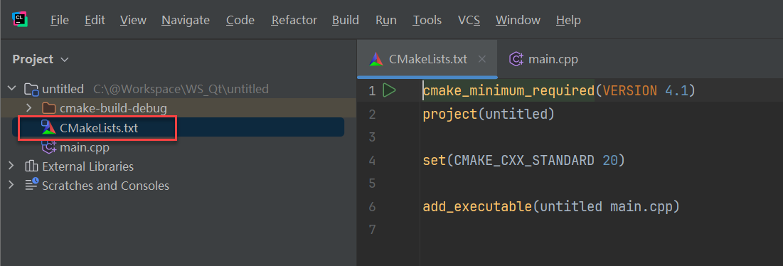 接下来,我们进入实际操作,首先用 IDE 创建一个项目,然后为其添加一些现成的源代码文件,配置 CMake 让其可以在 IDE 中运行起来,然后再改用命令行,手动完成一遍构建工作。