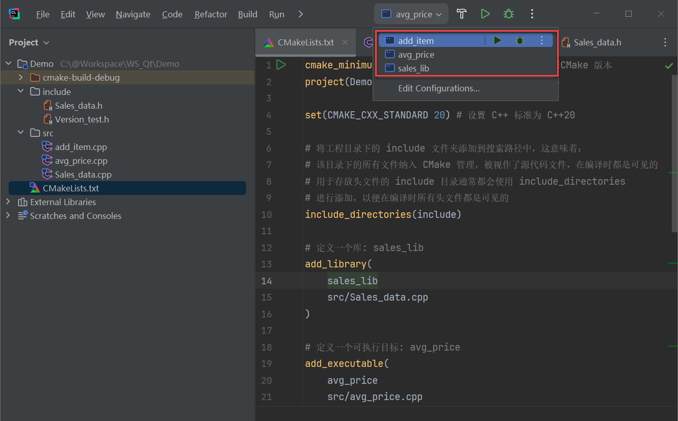 编辑好 CMakeLists.txt 文件后,在工程窗口上选中 CMakeLists.txt 文件,右键点选"Reload CMake Project",Clion 就会同步更新,这时,右上角的 Run Widget 下拉列表框中就出现了我们通过 CMakeLists.txt 定义的三个构建目标,点选 avg_price 或 add_item 就可以运行了!