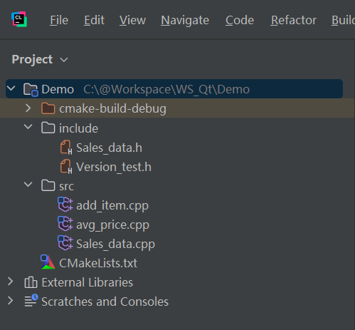 然后,我们可以找一些现成的 C++ 源代码文件添加到项目中以驱动后续的构建流程,本文,我们选择《C++ Primer》第五版第七章的四个示例代码文件:Version_test.h、Sales_data.h、Sales_data.cpp、avg_price.cpp、add_item.cpp,其中后两个是带有main方法的可执行类(你可以从这里:https://www.informit.com/store/c-plus-plus-primer-9780321714114 获得这些源码文件)。我们把前两个头文件放到 include 文件夹中,其余三个源文件放到 src 文件夹中。一切准备妥当后,工程目录应该如下: