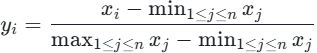 - 0~1标准化(离差标准化):将特征映射到[0,1]区间,公式: