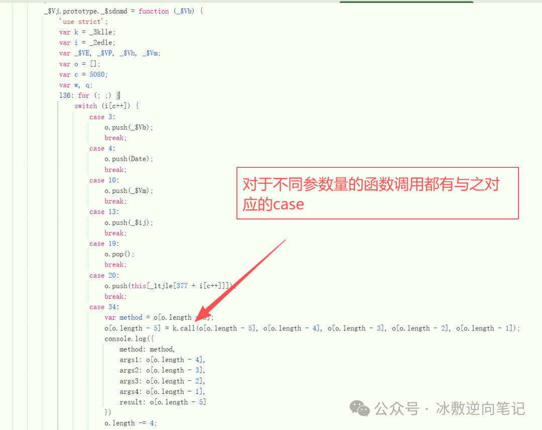 可以看到参数是通过js_security_v3_0.1.6.js 生成。粗看一边这个js,发现这个vm是通过for 循环加switch-case 控制,这种结构也很常见,比如阿里滑块,我们要做的依旧是找函数调用 和属性访问。与之前遇到的此种类型结构不同点是,js文件中有大量的函数是这种结构(for+switch),也就是说,每个函数都是一个小vm,而且对于函数调用来说,不同参数量的调用都有与之对应的case,这极大的增加了我们插桩的工作量,但是,我们依旧可以借助ai来帮我们插桩。