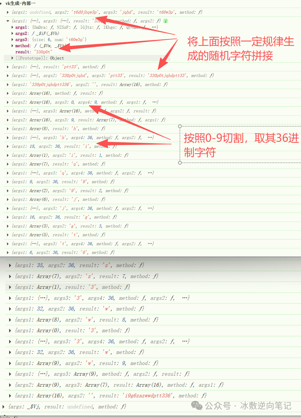 从日志中分析,可以得知一些逻辑。vk生成的第一部是获取一个4位的字符串,该字符串来源于一个固定字符串:t6d0jhqw3p。这像是一种伪随机筛选,通过 Math.random()和阈值比较(4)控制字符选择,小于4的被选中,最后按照特定的索引顺序(3,0,2,1)重新排列。