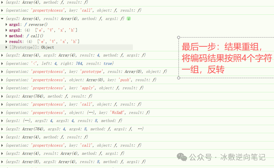 这一块逻辑分析起来确实耗时,日志粒度细一点,虽然日志很长,但大多是循环结果,所以分析循环内的一到两组日志便可推理出结果。整体逻辑就是采用base64自定义编码集,然后又进行了一系列的反转重组操作: