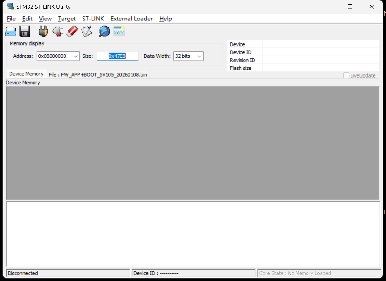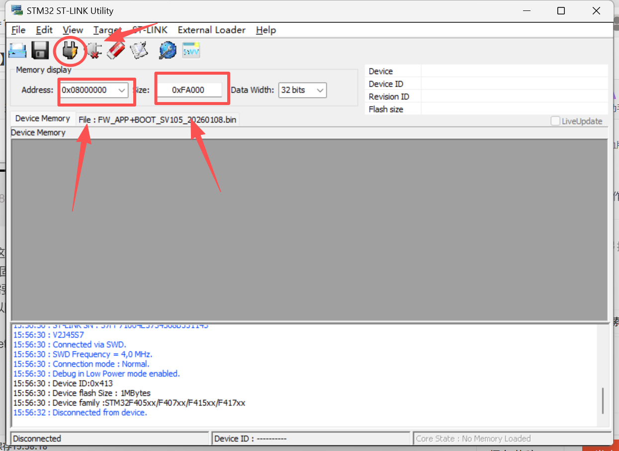 - 先把bootloader和app固件烧写到一个板子上(用这个工具烧写也可以),然后使用此工具,先设置需要读取固件的FLASH起始地址(如我的是0x8000000),以及需要读取的FLASH大小(最好设置为读取全片FLASH大小以防漏掉数据,比如我的芯片FLASH为1M=1000*1024K=0xFA000),点击Connect to target,也就是第三个插头🔌图标。
