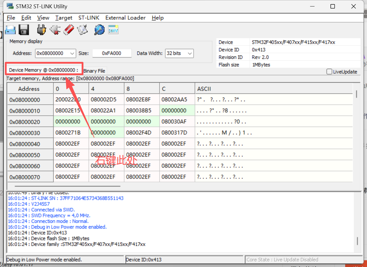 2.连接成功后,右键Device Memory,选择Save to File保存烧写的固件到文件,选择bin文件保存即可。这样我们就得到了合并后的固件!