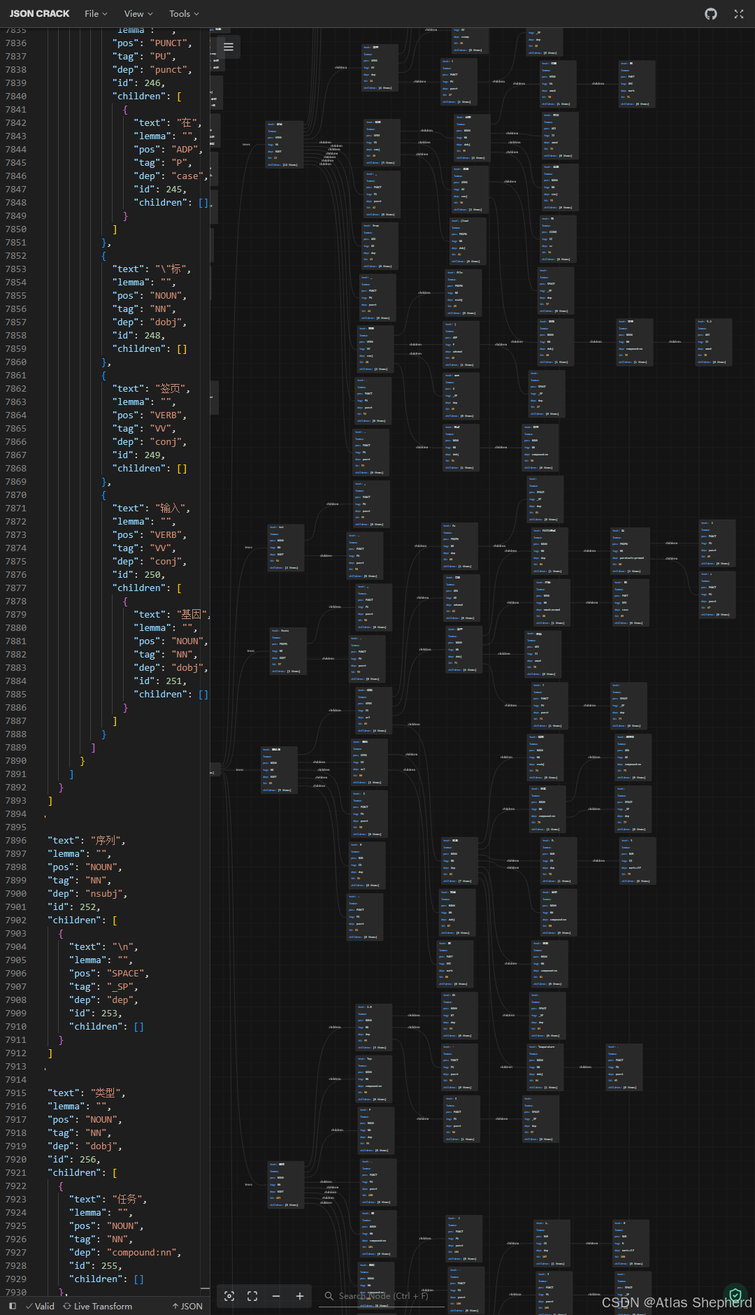 基于paCy模型进行依存句法分析,以json、yaml、xml、csv格式传入jsoncrack以二次可视