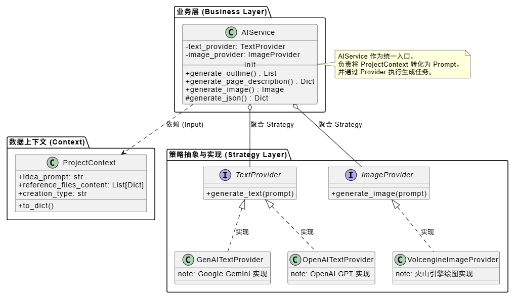 AIService 采用了策略模式 (Strategy Pattern) 进行设计。它定义了统一的业务接口(如 generate_outline, generate_image),而将具体的模型调用逻辑委托给 TextProvider 和 ImageProvider 接口的实现类。这种设计使得系统能够灵活切换底层模型(如从 OpenAI 切换至 Google Gemini 或本地模型),而无需修改上层业务代码。