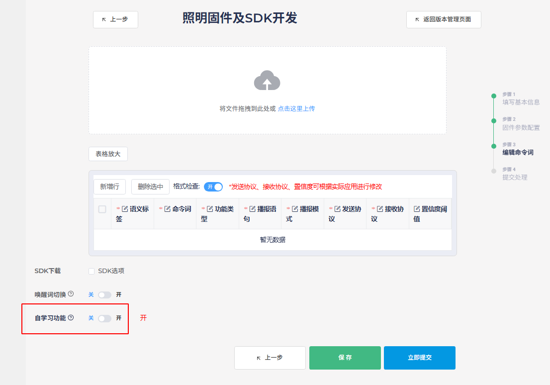 创建新项目,提交命令词列表并打开"自学习功能"生成固件;