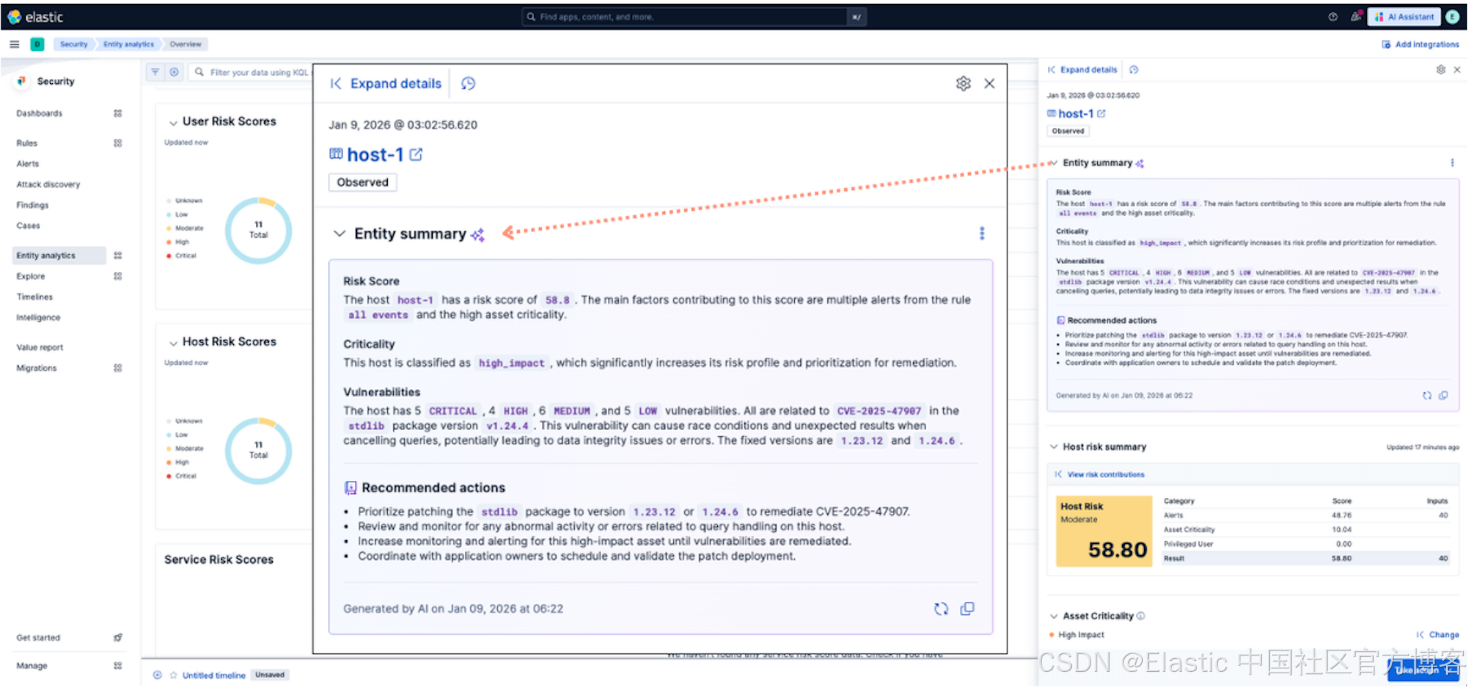 在 Elastic 9.3 中,实体分析(Entity Analytics)得到了增强,可以基于实体属性生成 AI 风险摘要,例如异常、漏洞、配置错误和资产关键性。